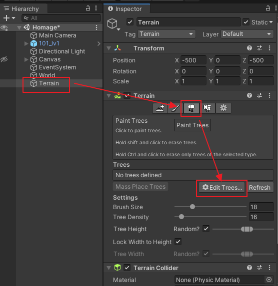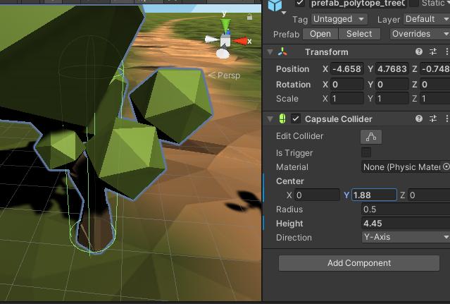 충돌박스를 박은 나무 prefab 을 Terrain Tree 로 심으려고 해보았다.