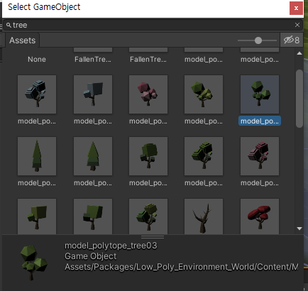 hierachy 에서 아까 월드에 배치한 나무를 확장하면 모델이 나오므로, 그걸 바로 드래그해서 넣어주면 된다.