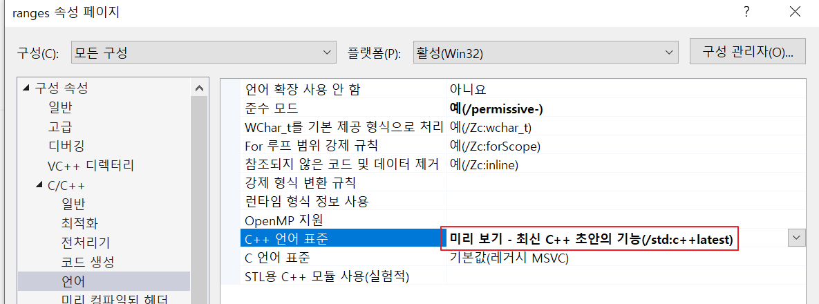 VS에서 <ranges> 라이브러리 등의 c++20 피쳐를 사용하려면,
