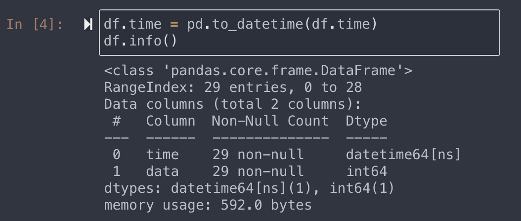 다음과 같이 time 컬럼을 datetime 타입으로 바꿔주자.