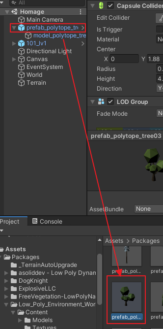 6. hierachy 의 나무 오브젝트를 Prefab 에 다시 덮어씌워서, Prefab 을 업데이트한다.