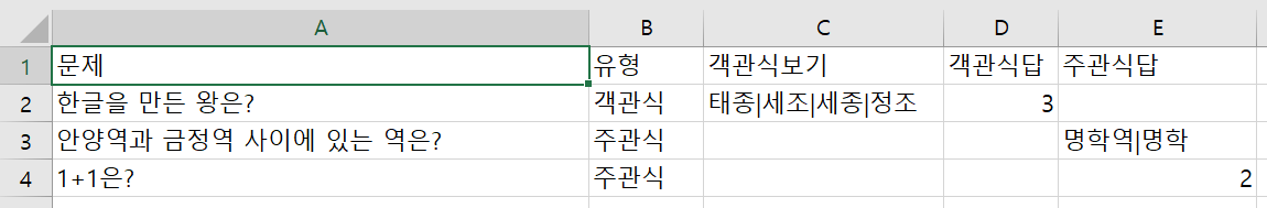 첫번째 줄은 그대로 두고, 두번째 줄부터 문제/문제유형/보기/답을 입력하면 된다.